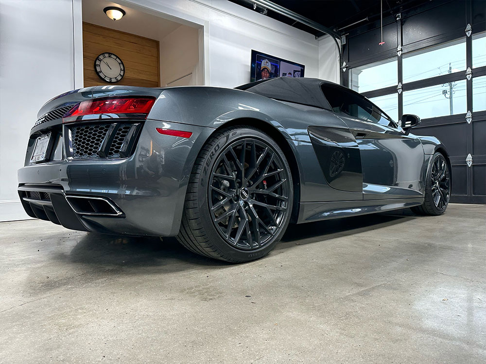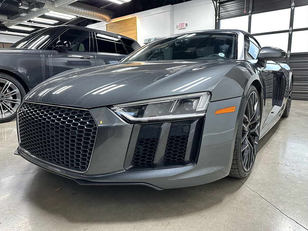 The Barrow Body Shop was chosen because of it's proven track record to repair this R8. Our certified technician got to work, repairing all of the rock chips, replacing the windshield and repairing the rear end. As you might have guessed it, the engine had to come out for the repair to commence. After the repair was completed, the entire vehicle was painted with the recommended Audi paint. You can see the result yourself.